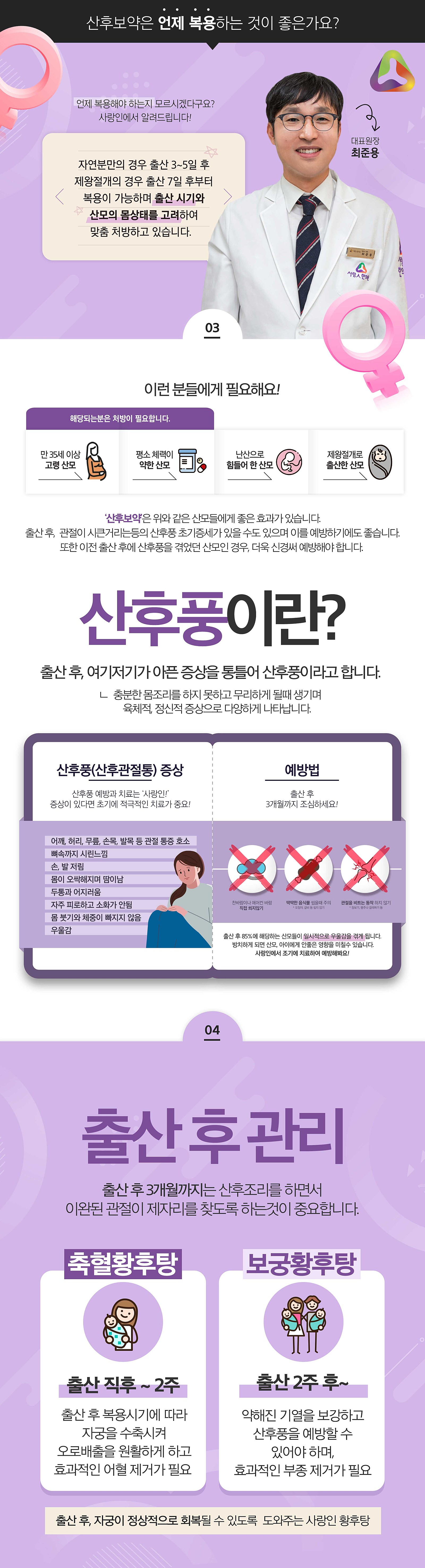 만 35세가 넘어가는 고령의 산모님들 그리고 평소 체력이 약하신 산모님들! 출산시 난산으로 인해서 힘들어하신 분들과 제왕절개로 아기를 낳으신 분들께서는 더더욱이 청주산후보약의 도움을 받아주시는 것이 좋다고 말씀을 드릴 수 있으니 출산 후 생길 수 있는 문제들 빠르게 예방하여 주시기를 바라겠습니다. 제왕절개를 하신 분들의 경우 일주일정도의 시간이 흐른뒤부터 복용해주시는 것이 좋으니 참고하시면 된답니다.